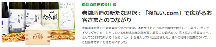 白鶴酒造の「後払い.com」導入事例はこちら。担当者インタビューを掲載しています。